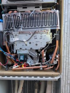 給湯器凍結破損による部品交換しました。ビフォー分かりづらいですが、右下水抜きツマミ破損